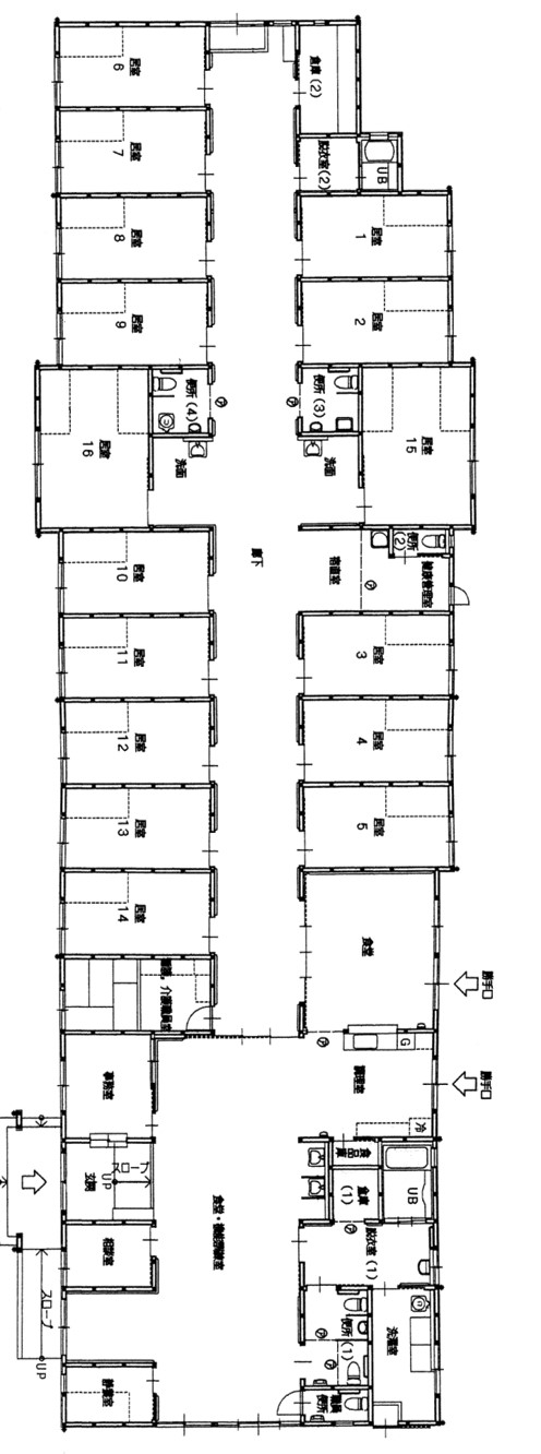 横に長い平屋建ての構造で、ほとんどが居住スペースです。